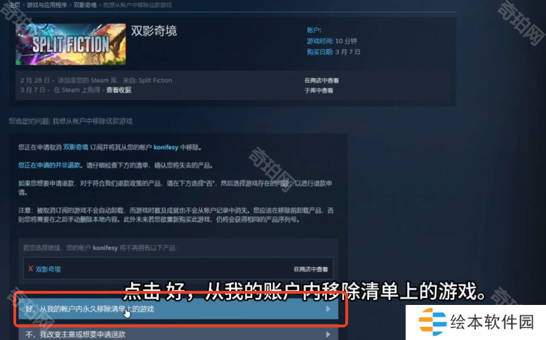 3、然后点击好,从我的账户内永久移除清单上的游戏