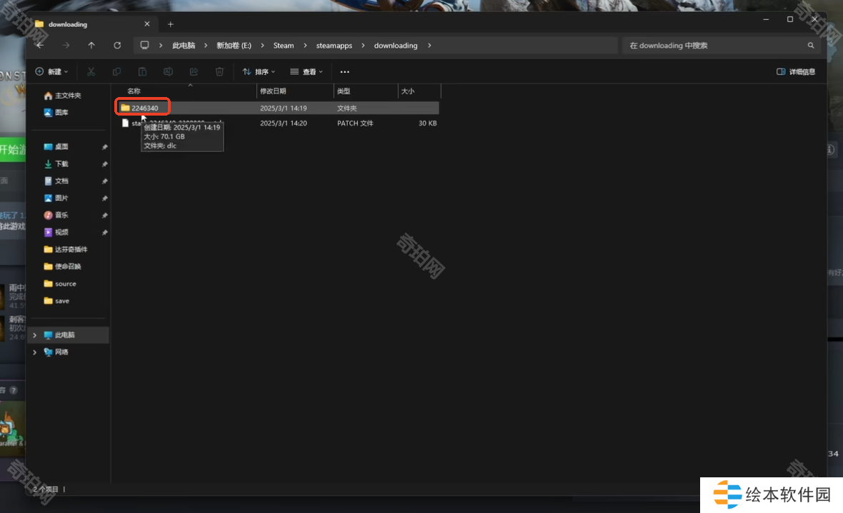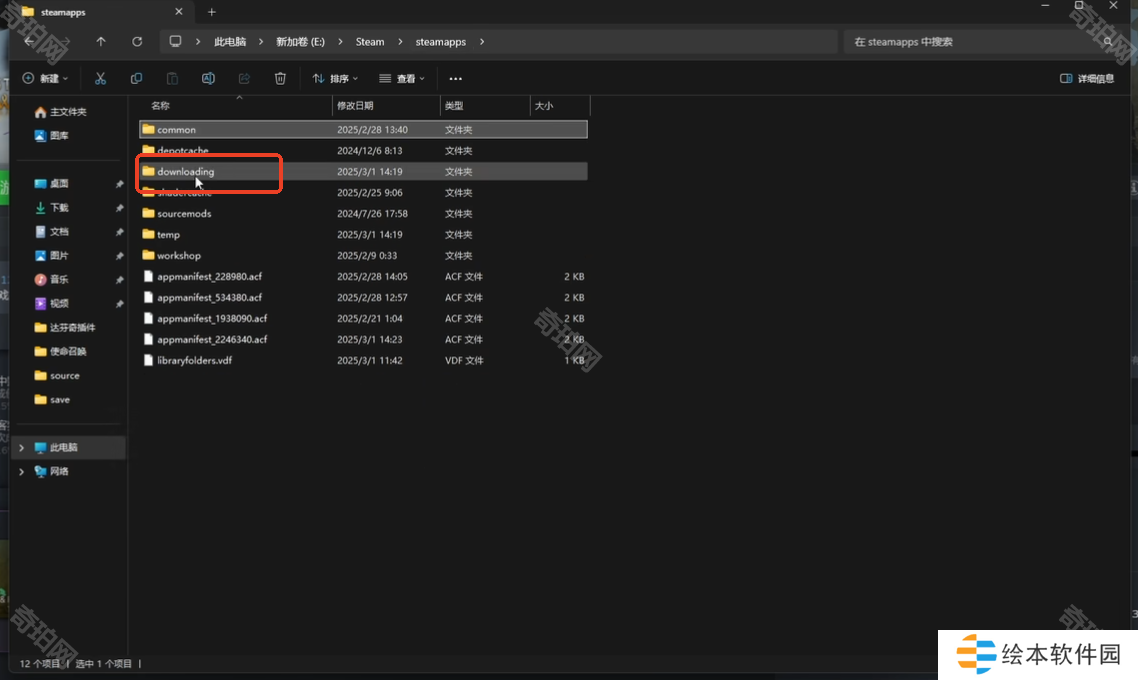 4、我们查看文件管理器上方的文件路径,进入steamapps这个文件夹,点击downloading文件夹
