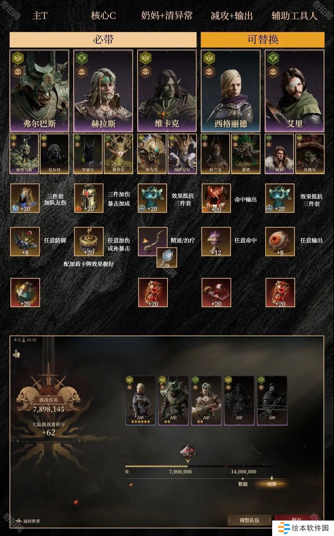 ①群体输出及减益:小技能伤害不高,几乎可以忽略,大招幽灵戏要会大范围攻击并施加多种异常,所以减攻击和效果抵抗很重要,范围内工具人选择潮汐三件套,抵抗同时回血