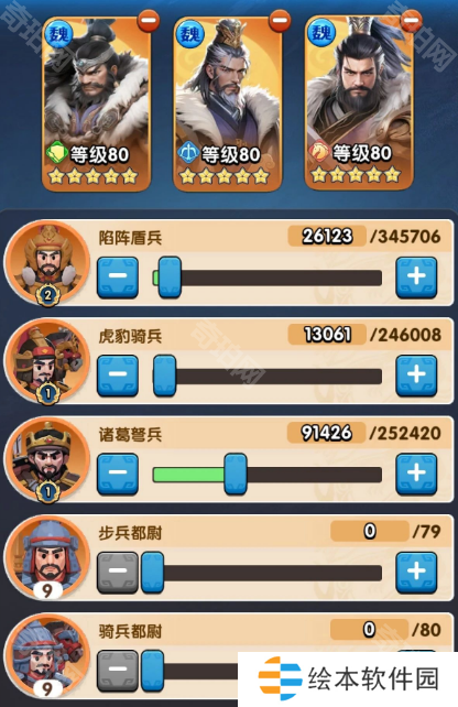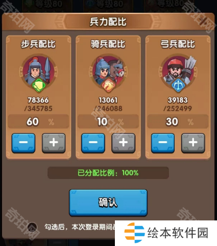士兵数量首先平均分配,直到卡关卡为止,失败不消耗体力,卡关之后,骑兵弓兵出少一些,步兵出征拉到75000左右扛伤害,能再次冲关。