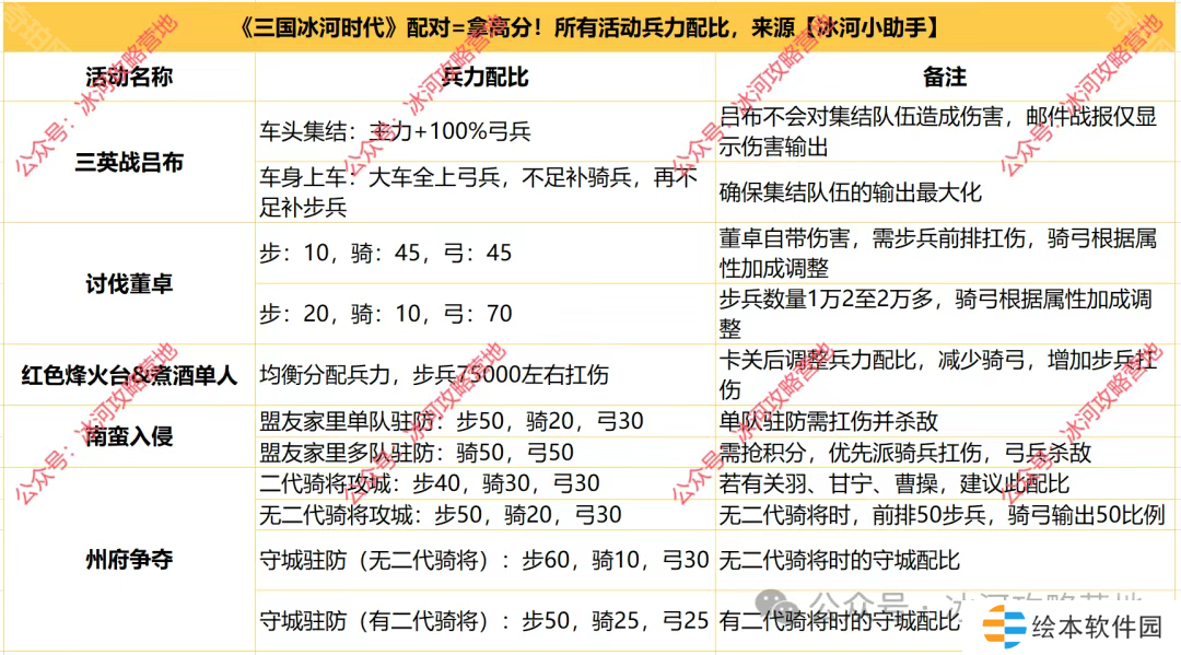 三国冰河时代S4赛季所有活动兵力怎么分配?在游戏三国冰河时代中每个队伍我们都需要设置3个兵种的分配比例,有些兵种在一些活动中会有奇效。七珀小编在这里整理了S4赛季中所有活动推荐的兵力配比,有需要的小伙伴接下来就一起看看吧。