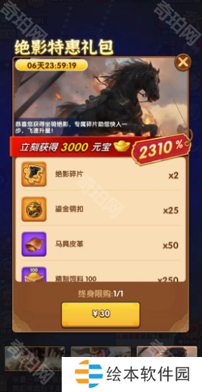 30欢乐豆—绝影碎片x2,铜扣x25,马革x50,粮草2万5。