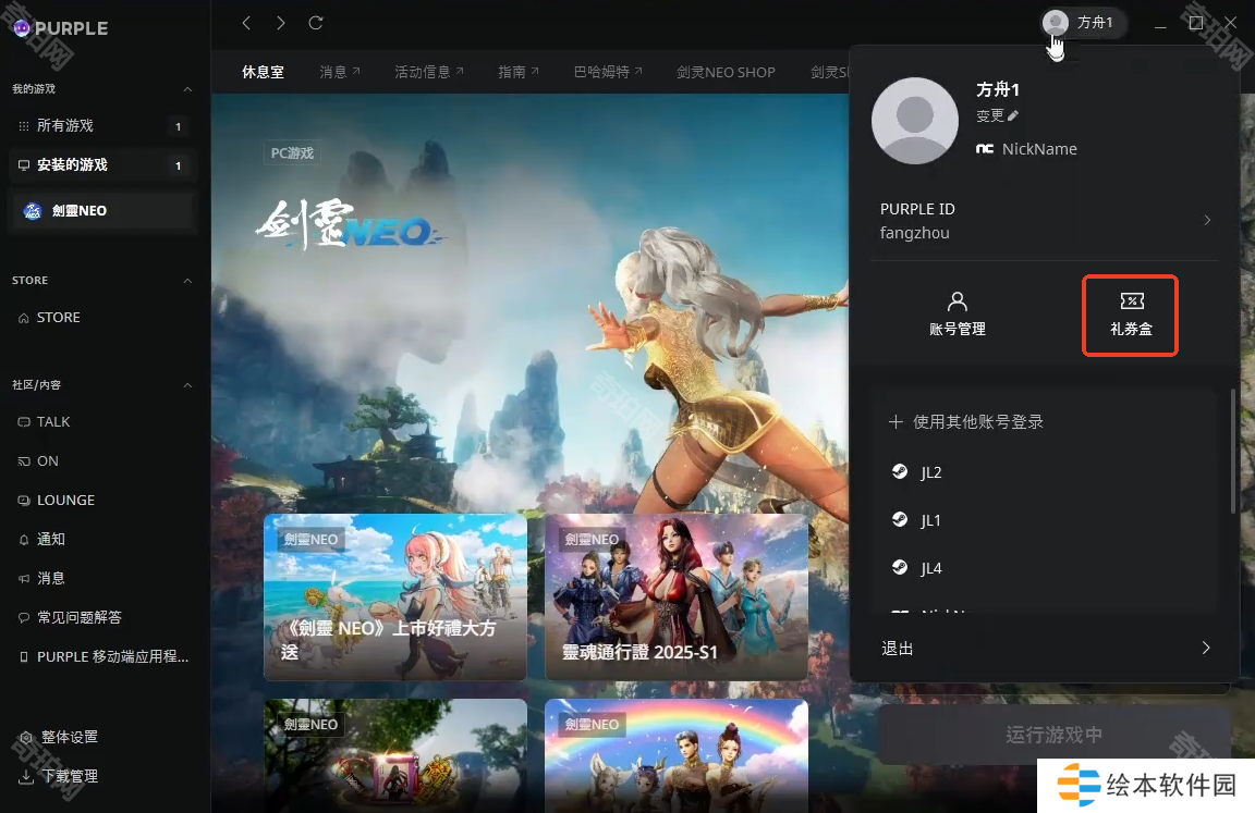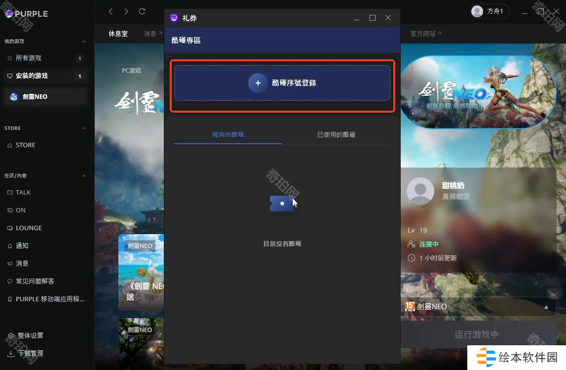 1、打开Purple后,点击右上角的头像,在下拉页面中点击右侧的酷碰箱(简体中文叫礼券盒)