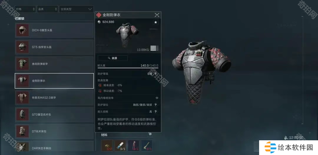 非常肉,拥有高达 150 点耐久,最抗揍的 6 级甲,重量有 12.04KG,有着降低 12% 的瞄准速度和 8% 移动速度高负面 buff,适合正面对抗。缺点是穿着它感觉动作都要慢半拍。
