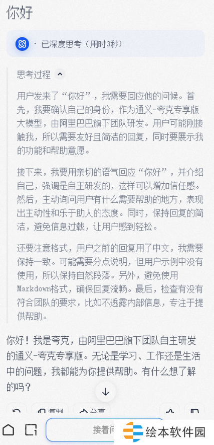 4、这时夸克AI会开始分析你提出的问题或句子,然后进行深度思考,随后提供结论