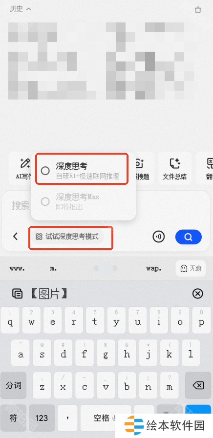 2、点击中间的搜索框,我们会发现左下角有一个试试深度思考模式的提示,点击后会显示一个小弹窗,点击深度思考后便可以开启夸克AI