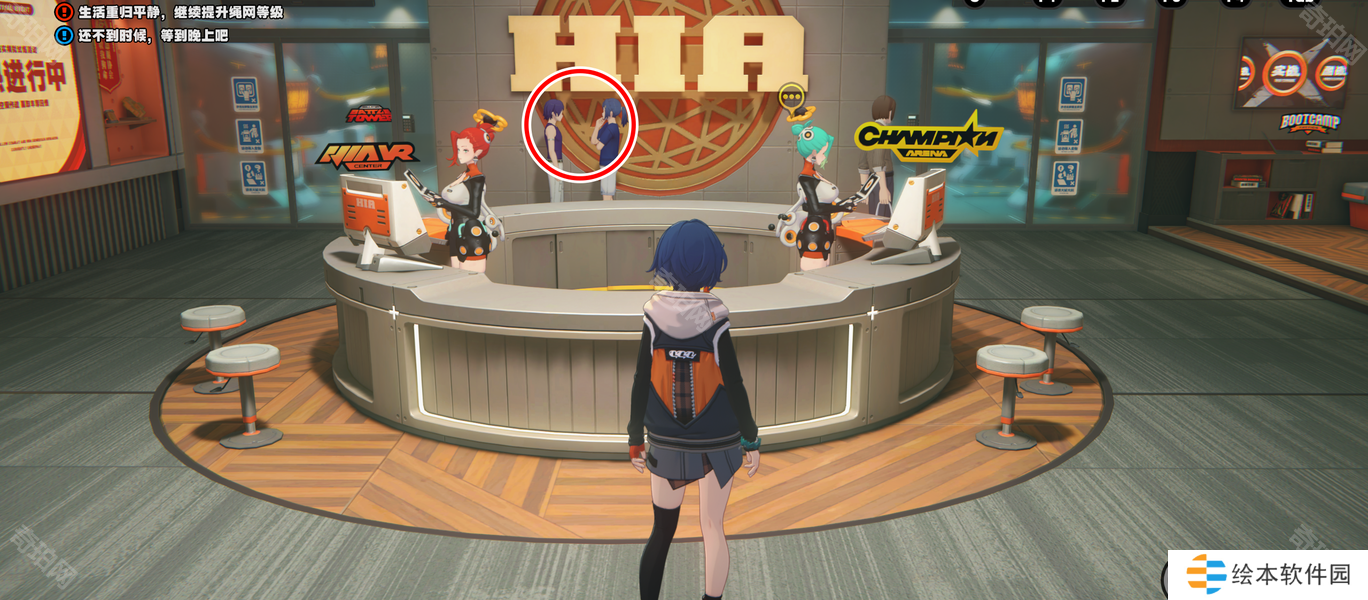 和HIA标牌前的两个男生对话即可