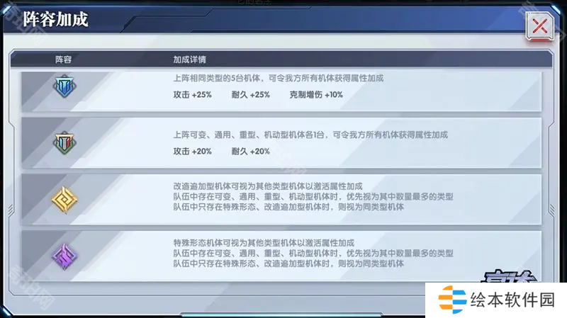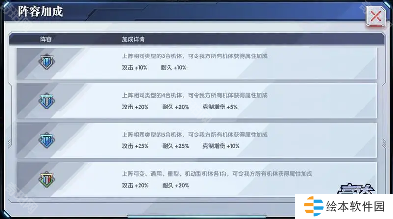 若可变、通用、重型、机动各上阵一台机体,则可激活20%的攻击和耐久阵容加成