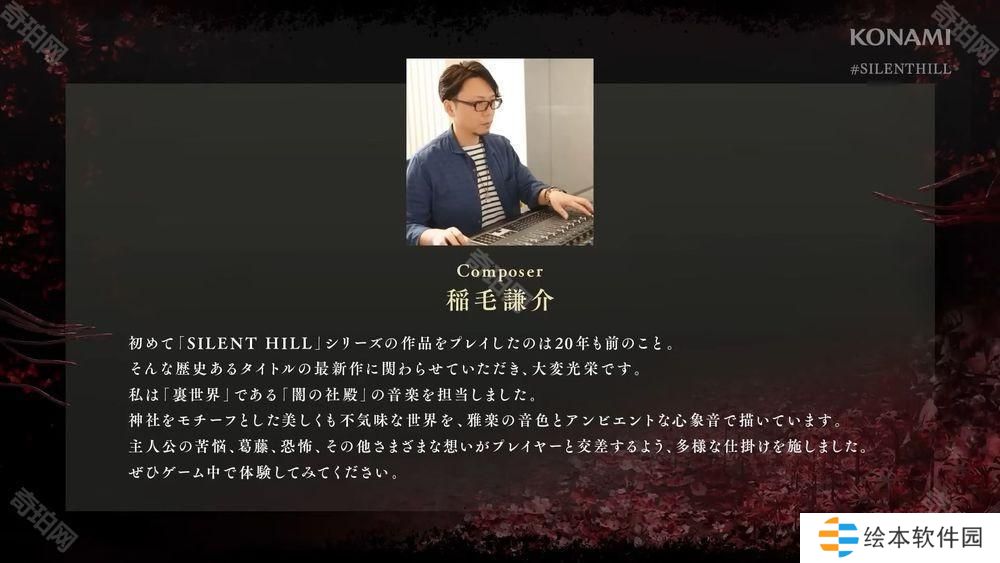 而负责「里世界」也就是「黑暗社殿」音乐制作的稻毛谦介则表示,自己第一次玩「寂静岭」系列的作品已经是 20 年前的事了,能够参与这个悠久歷史的系列最新作是极大的荣幸。他将透过雅乐的音色与氛围感十足的心象音,来描绘以神社为主题的美丽又诡异的世界,并设计了多种音乐表现方式,让主角的苦恼、纠结、恐惧,以及各种情感能够与玩家的感受有所交集。