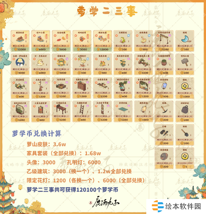 萝学币共计可获得120100,推荐先把萝山皮肤、家具套装、头像、孔明灯乙级建筑和限定花灯换了
