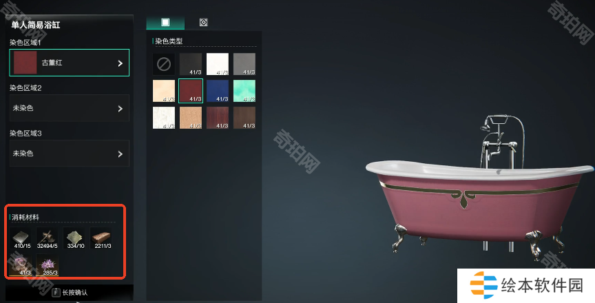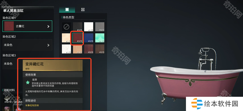 5、有些家具的染色方案会要求指定道具,比如浴缸有一个颜色就需要材料变异藏红花