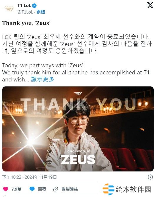 《英雄联盟》世界冠军T1战队宣布上路选手 Zeus 离队