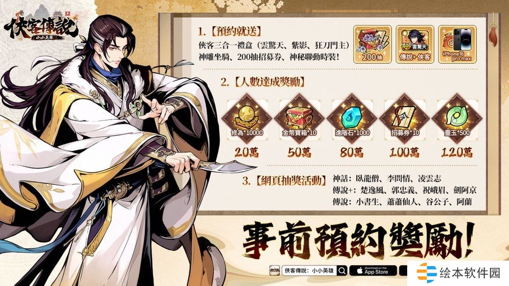 《侠客传说:小小英雄》事前预约活动现已正式开启,现在参与预约即可领取丰富预约奖励,追踪官方粉丝团参与抽奖还有机会赢取 iPhone16ProMax!官方将陆续释出游戏相关最新情报,欲知更多第一手消息,请密切关注后续报导与官方粉丝团贴文。让我们共同期待《侠客传说:小小英雄》的正式上缐,见证官方为广大武侠爱好者献上一场独一无二的武林盛宴!