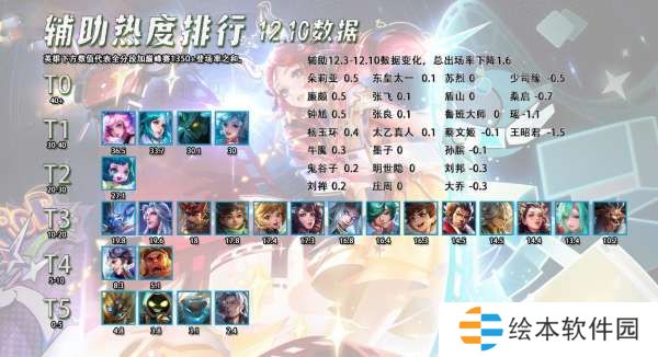 辅助这个星期因为没有相关改动,所以出场率的波动非常小,王昭君的出场率越来越低,最近也不常见到走辅助位的了,估计用不了多久就会把她从辅助排行榜中踢出去。