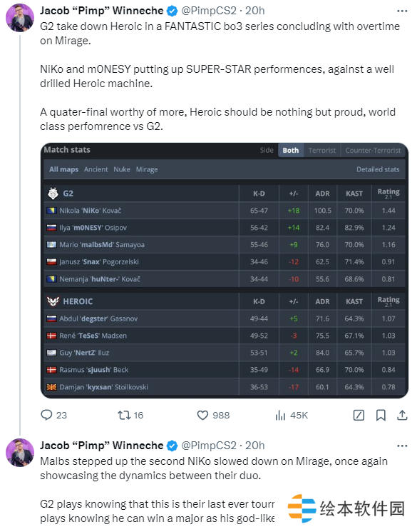 “G2凭借在Mirage加时赛的精彩表现击败了HEROIC。NiKo和m0NESY以超级明星的表现,最终在BO3比赛中战胜了训练有素,执行力如同机器一般的HEROIC。