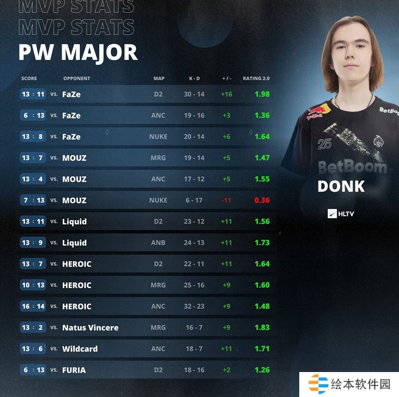 从Major开幕赛阶段对阵FURIA的第一场比赛开始,donk就在不断支配对手。在全部14张Major地图上,他只有一张地图rating低于1.25,剩下的地图rating全部在1.25以上。在总决赛图三中,他更是以1.98的超高Rating带领队伍走向胜利!