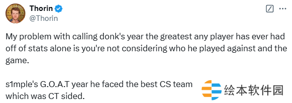 Thorin:donk还称不上GOAT,s1mple当年面对的是巅峰A队