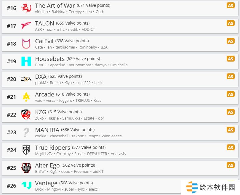 Virtus.pro小跌一名排在第21名;25名和26名则是