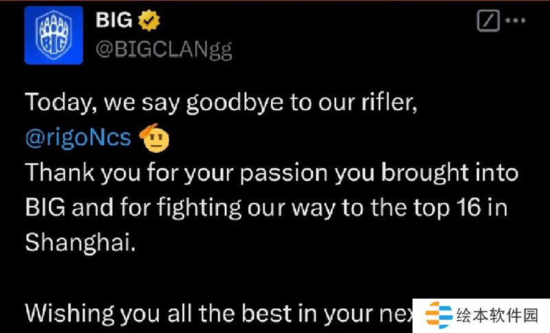 “今天,我们与我们的步枪手rigoN告别,感谢你为BIG带来的激情以及为我们在上海Major闯入前16名的努力,祝您在生涯旅途的下一篇章中一切顺利!”