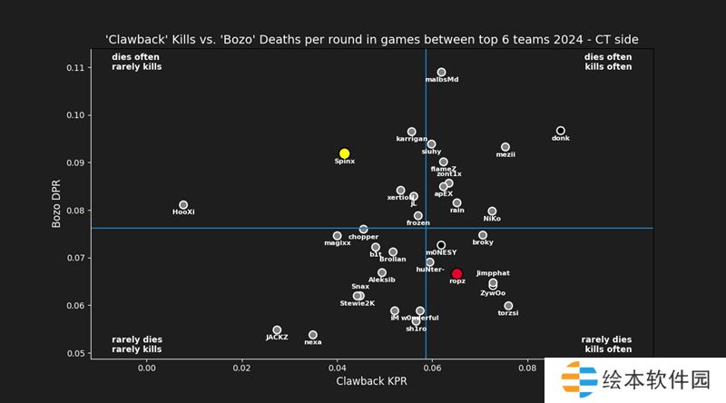 从角色分工上看,ropz与Spinx存在一定的重叠,但两人的风格却大相径庭。根据网友btrams对俩人在残局阶段的表现(在人数优势下阵亡导致输掉回合,以及在人数劣势下击杀对手从而赢下回合)的分析,可以清晰地看到ropz在击杀效率上要优于Spinx。其中在防守端,俩人的差异最大,ropz在今年对阵TOP6队伍时,他能够用更少的死亡换取更多的击杀,而Spinx的风格则略显莽撞,经常在队伍手握人头优势的情况下冒进而丢分。而在进攻端,两人的击杀效率相差无几,但Spinx的存活率更高。