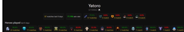 通过dota2protracker可查Yatoro的上分主力是卓尔游侠,22场有恐怖的90.9%胜率,紧随其后的是变体精灵、敌法师和美杜莎。