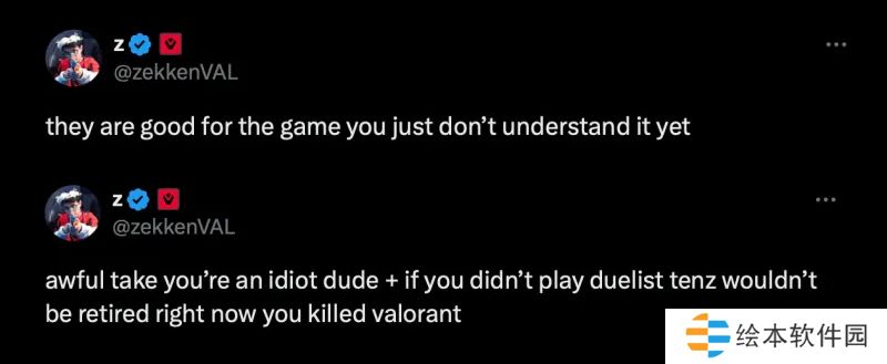 随后zekken下方评论:他们对游戏是有好处的,你只是还不明白。太可怕了,你是个白痴+如果你不玩决斗位,tenz现在就不会退役了,你毁了瓦洛兰特。