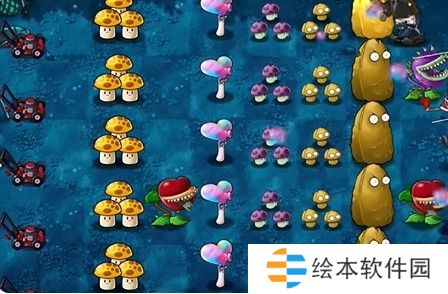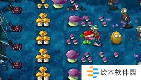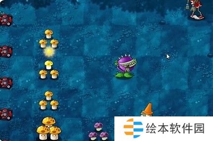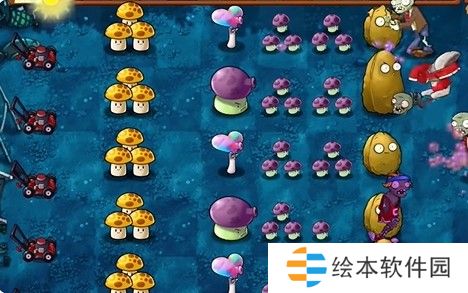 3、将樱桃炸弹种在食人花上,在中间种植多个大喷菇和多格小喷菇。