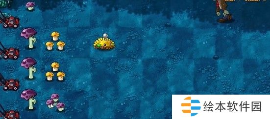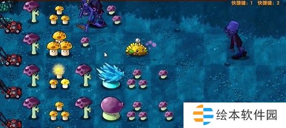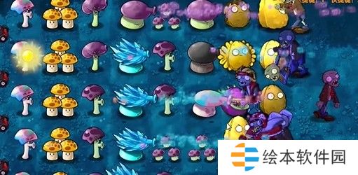 3、补齐一列左侧的胆小菇和阳光菇,在外侧种植两个大喷菇,再将寒冰菇种在大喷菇上。