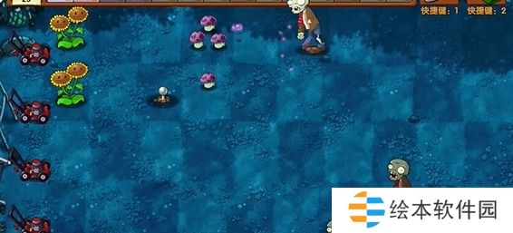 2、先在左侧种植多个向日葵生成两个双子向日葵,在中间种植多个小喷菇。