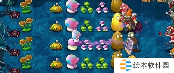 3、继续在左侧合成多个双子向日葵,在中间补充多个小喷菇和两个大喷菇。