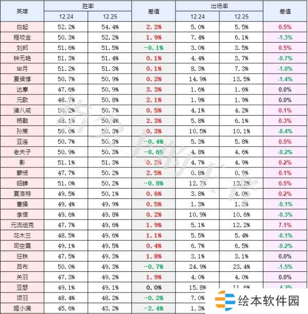 总结:本次对抗路虽然加上了传送,但第一天还并没有开发出来,所以胜率变化不大很正常,但减速的削弱,让关羽变强了也是明显能看出来的,姬小满第一天数据不理想,但潜力巨大,大家可以多多关注,白起目前是胜率最高的英雄,赶紧去玩吧。
