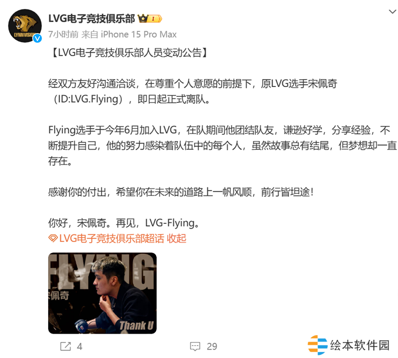 经双方友好沟通洽谈,在尊重个人意愿的前提下,原LVG选手宋佩奇(ID:LVG.Flying),即日起正式离队。