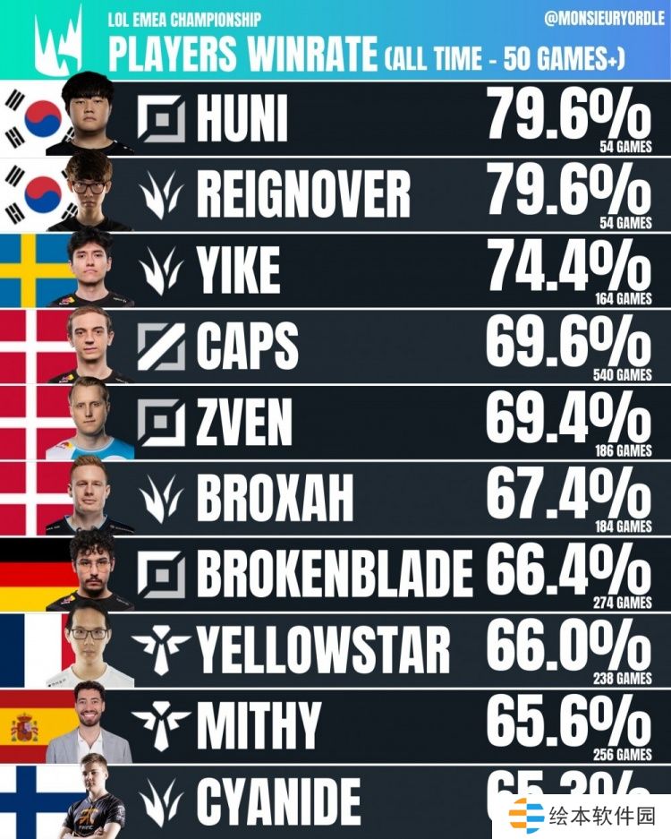 直播吧1月6日讯 LEC历史上胜率最高的选手排名公布,Huni和Reignover两位韩援以79.6%的胜率并列第一。