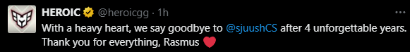 HEROIC:怀着沉重的心情,我们在度过了4年难忘时光后,向sjuush道别。感谢你的一切。
