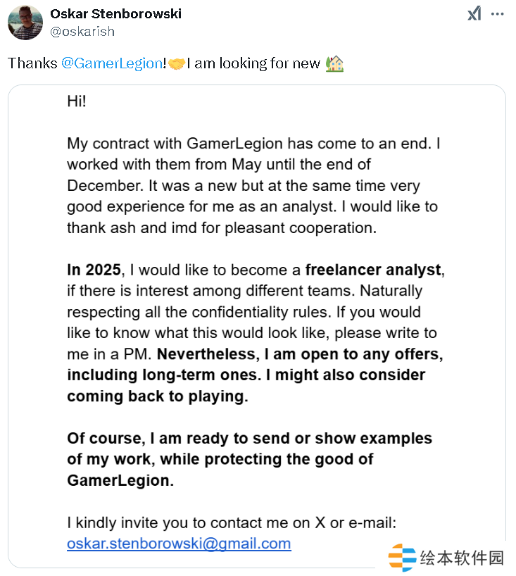 您好!我与GamerLegion的合同已结束,我从5月工作到12月底。作为一名分析师,这段经历对我来说既是新的挑战,也是非常好的体验。我想感谢ash和imd的协作。2025年,我希望能继续担任分析师,如果有哪个团队对此感兴趣,我自然会遵守所有保密规则。我对任何报价都持开放态度,包括长期合作的机会。我也可能考虑重返职业选手的行列。当然,我随时准备向您展示我的工作示例,同时会保护GamerLegion的利益。