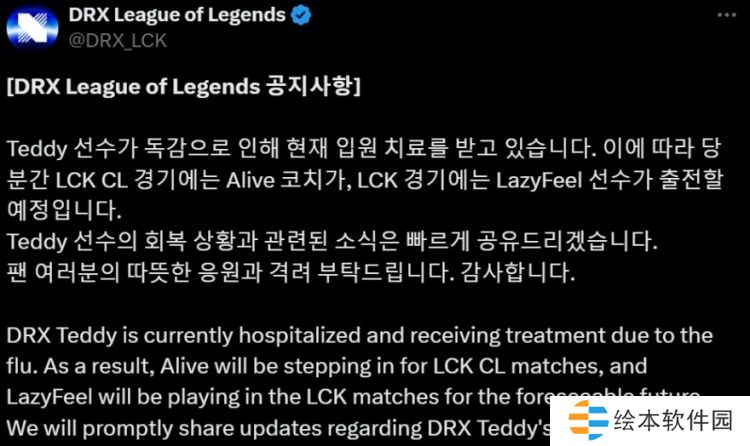 DRX官方:Teddy因流感入院治疗,越南选手LazyFeel将继续参加LCK