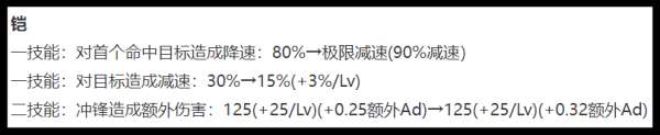 而体验服S38赛季对大批量英雄进行的调整中,铠也在其中,1技能命中的首个目标减速从80提升到了90%,但后续目标的减速从30%变成了15%-30%,在我看来这是削弱的,因为减速是有衰减的,实际上体感80%和90%很难表现出来。