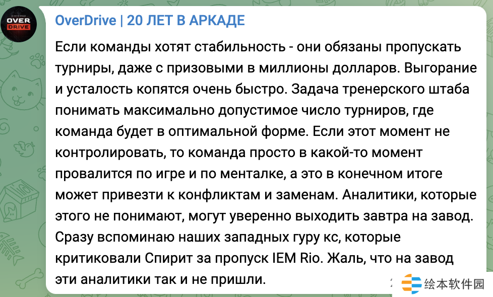 “如果战队想要保持稳定,就算是有数百万美金的奖金池,他们也不得不放弃一些比赛。不然倦怠和疲劳会迅速累积,教练组的任务就是了解战队能够达到最佳状态所需要的时间,以及极限状态下的比赛场次。如果不控制这一点,战队就会在某些时候在发挥和心态上出现问题,最终导致冲突和换人。没有意识到这一点的分析师,明天就可以进厂了。这让我想起了当时批评Spirit跳过IEM 里约的那些西方分析师们,就好像是从来没有参与过这些工作一样。”