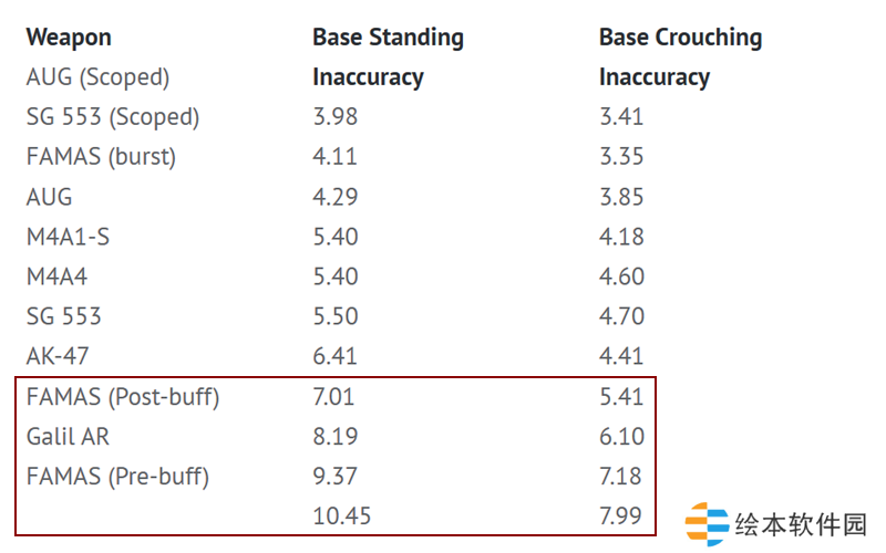 虽然Valve没有透露他们具体对FAMAS的站立和蹲下射击精度做了多少调整,但知名武器分析师SlothSquadron在1月28日公布了自己的研究结果,根据SlothSquadron的最新对比,改进后的FAMAS比它对应的进攻方武器Galil AR精度更高。