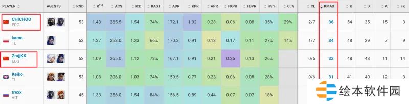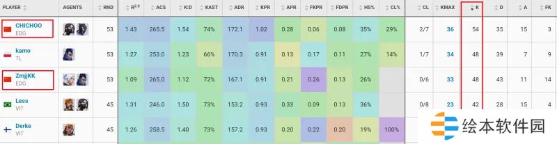最高击杀:CHICHOO、ZmjjKK分别位列第一、第三