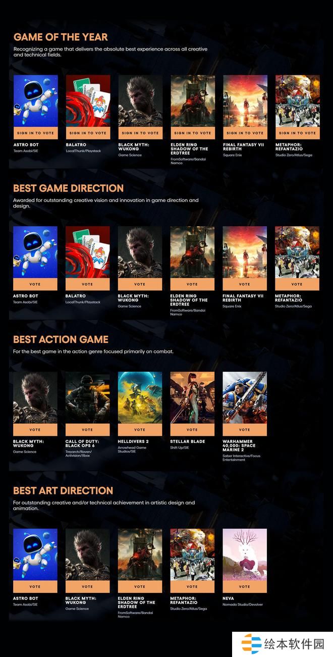 本届评选中的另一大亮点,则是国产单机动作游戏大作《黑神话:悟空》共获得4项提名,分别为:年度游戏大奖提名、最佳游戏指导大奖提名、最佳动作游戏大奖提名以及最佳艺术指导大奖提名。