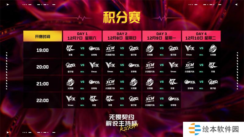 本次无畏契约解说主持杯KICKOFF将分为三个阶段:12月7日至12月10日的积分赛阶段,12月12日、14日和15日的淘汰赛阶段,12月18日的总决赛。