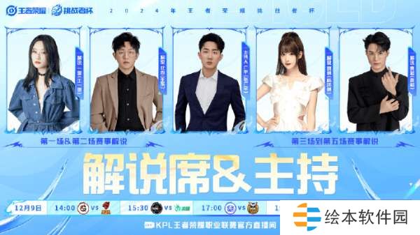 解说席&主持人:解说一雪 (王一雪)、北岛bbb (王东)、广宇有话说(张广宇)、解说琪琪 (杨泽琪)、GK黄色超人oye (黄超)